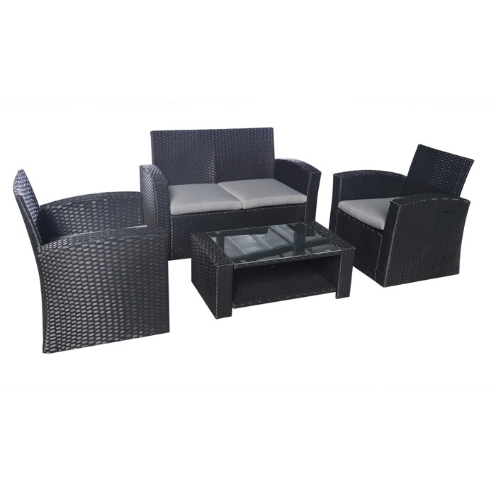 Suncrown Outdoor Sectional 4 Piece Patio Sofa Set Grey Checkered Wicker Furniture With Black Washable Seat Cushions And Glass Coffee Table Waterproof
