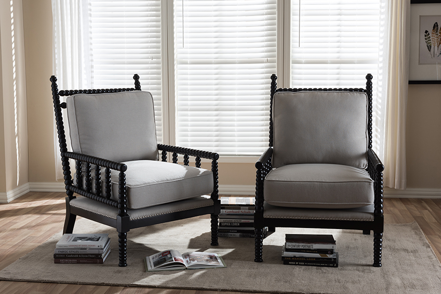 Baxton Studio Hillary Modern And Contemporary Beige Fabric Upholstered And Black Finish Wood Spindle Back Accent Chair Set Of 2