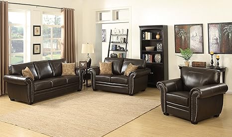 Ac Pacific Louis Collection Traditional 3 Piece Upholstered Leather Living Room Sectional With Antique Nail Head Trim And 2 Accent Pillows Brown