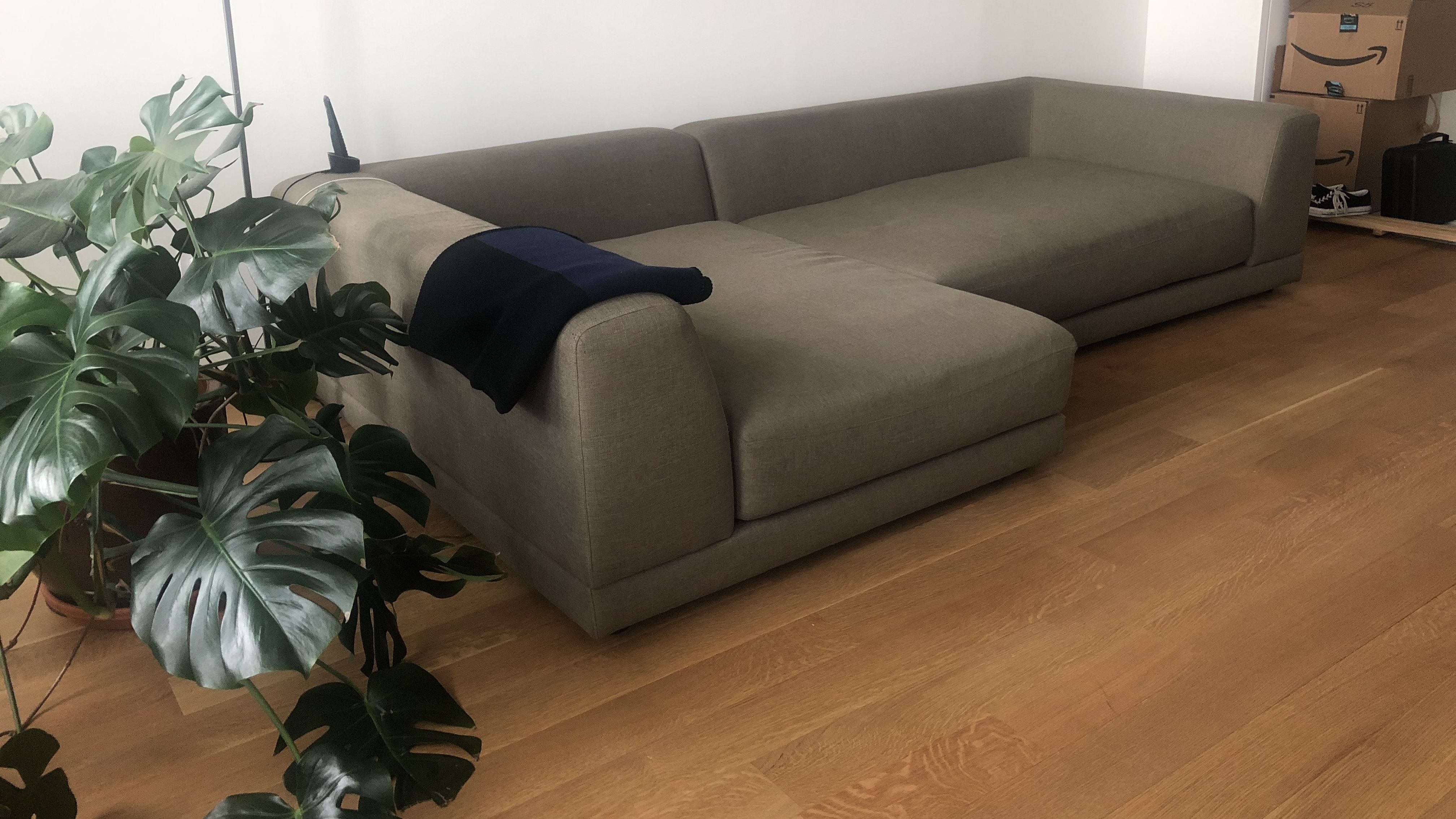 Low to the ground on recessed plastic feet. Seat cushions flip to reverse. Uno 2 piece sectional sofa by cb2 the big one.