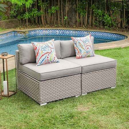 Cosiest 2 Piece Outdoor Furniture Add On Armless Chairs For Expanding Wicker Sectional Sofa Set W Warm Gray Thick Cushions 2 Floral Fantasy Pillows