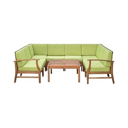 Lorelei Outdoor 8 Seater Teak Finished Acacia Wood Sectional Sofa And Table Set With Green Water Resistant Cushions