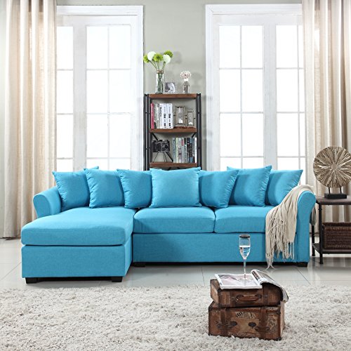 Modern Large Linen Fabric Sectional Sofa L Shape Couch With Extra Wide Chaise Lounge Sky Blue