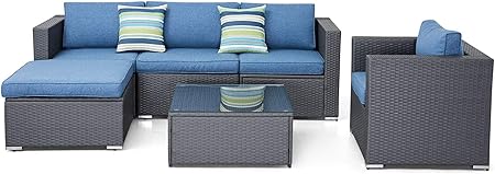 Solaura Outdoor Furniture Set 6 Piece Wicker Furniture Modular Sectional Sofa Set Dark Grey Wicker Olefin Fiber Soft Denim Blue Cushions With Ykk