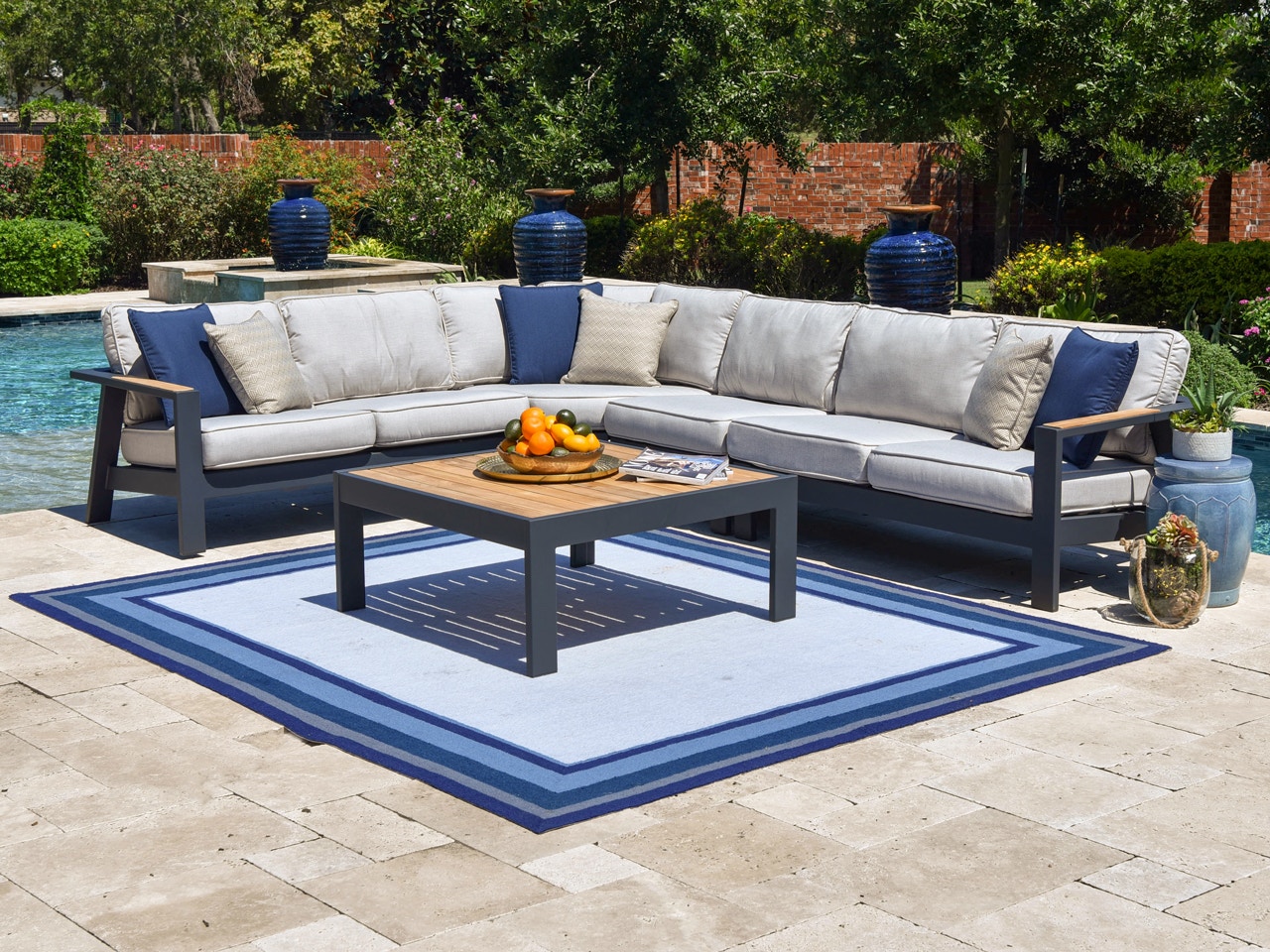 Torino Dark Grey Aluminum Torino Cushion Sectional With 40 In Teak Slat Top Coffee Table