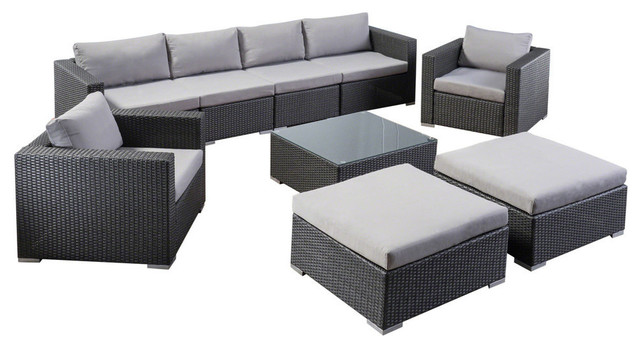 Ohana Mezzo 7 Piece Outdoor Wicker Patio Furniture Sectional Conversation Set Black Wicker With Gray Cushions No Assembly With Free Patio Cover