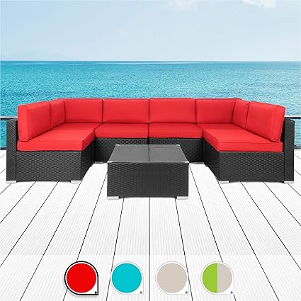 Walsunny 7pcs Patio Outdoor Furniture Sets Low Back All Weather Rattan Sectional Sofa With Tea Table Washable Couch Cushions Black Rattan Red