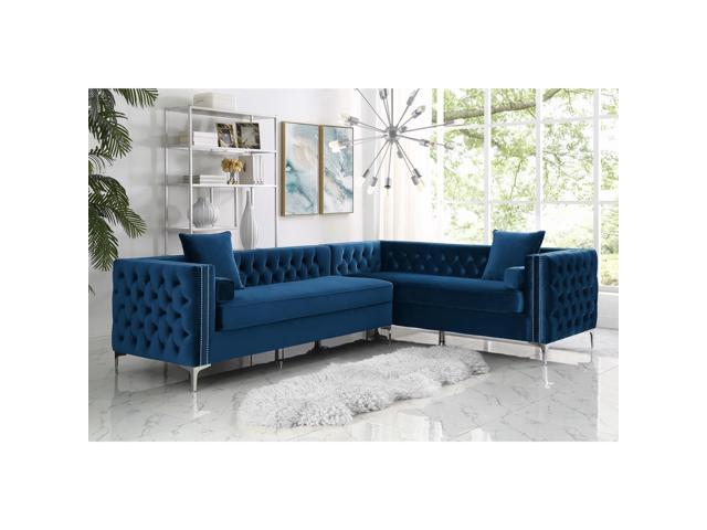 Lorenzo Blue Corner Sectional Sofa 120 Right Facing Velvet Tufted Nailhead Metal Legs Modern Contemporary Inspired Home