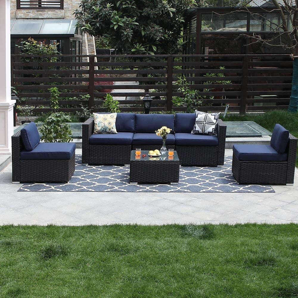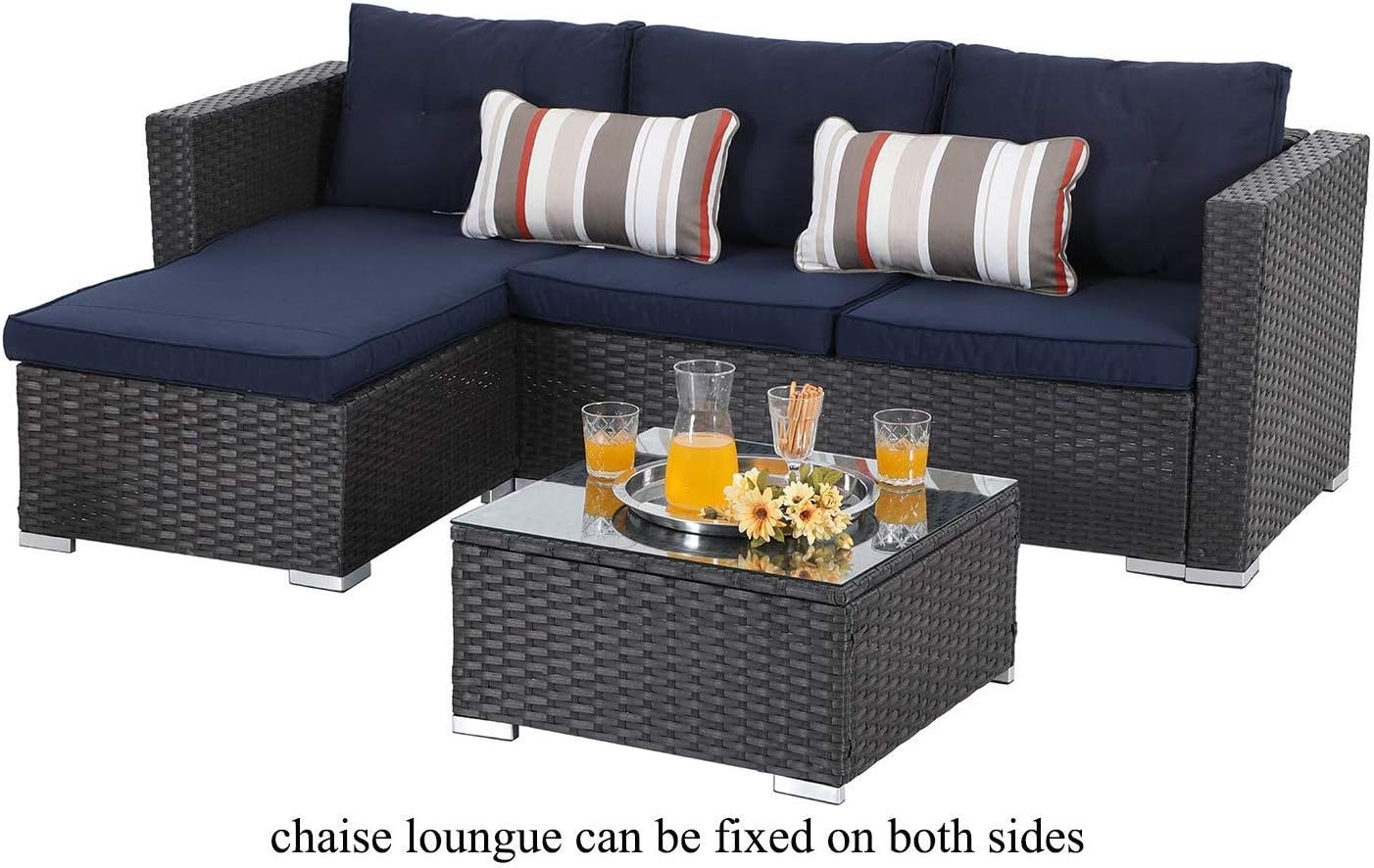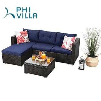 Phi Villa 3 Piece New Patio Sectional Furniture Outdoor Sofa Set With Upgrade Rattan Wicker Navy Blue