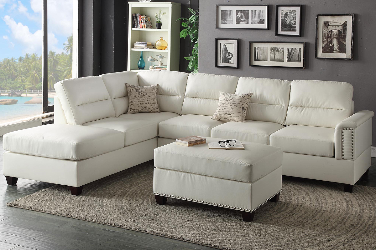 Poundex F6977 White Bonded Leather Sectional Ottoman Sofa Set