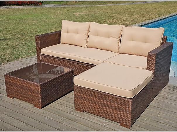 Sunsitt Outdoor Sectional Sofa 4 Piece Furniture Set Brown Wicker With Beige Seat Cushions Ottoman Glass Coffee Table Patio Backyard Pool Steel