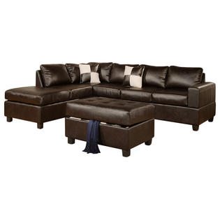 Poundex Reversible Sectional Sofa Set With Ottoman Chocolate With Espresso Faux Leather Base