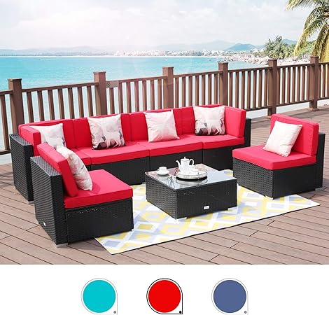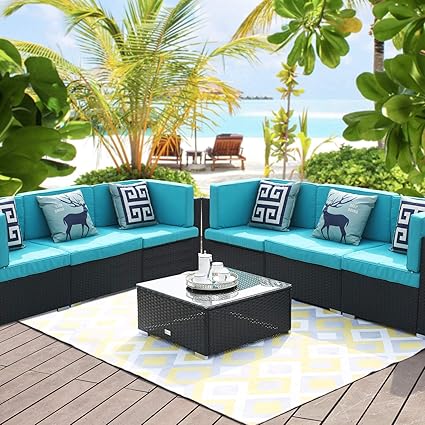 Luckwind Patio Conversation Sectional Sofa Chair Table 7 Piece All Weather Black Checkered Wicker Rattan Seating Cushion Patio Ottoman Modern Glass