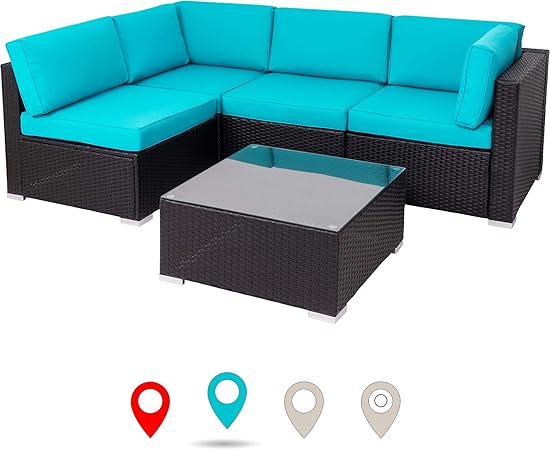 Walsunny Outdoor Black Rattan Sectional Sofa Patio Wicker Furniture Set Conversation Sets With Tea Table Washable Couch Cushions Blue