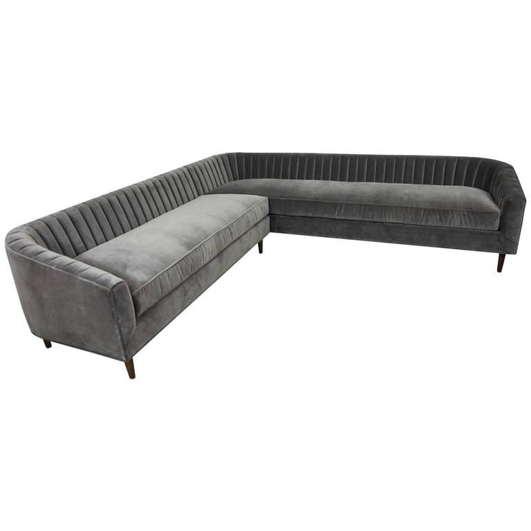 Art Deco Style Sectional In Charcoal Velvet W Down Cushions Long Arm Tufting