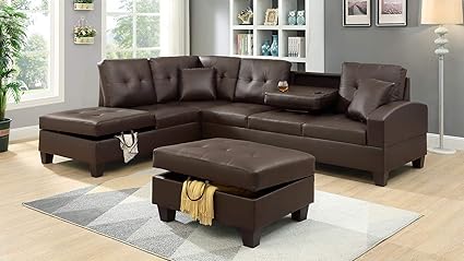Gtu Furniture Pu Leather Living Room Irreversible Living Room Sectional Sofa Set In Black White With Ottoman Brown