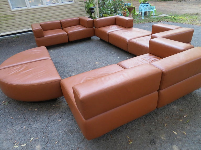 Harvey Probber Magnificent 9 Piece Harvey Probber Caramel Brown Leather Cubo Sectional Sofa