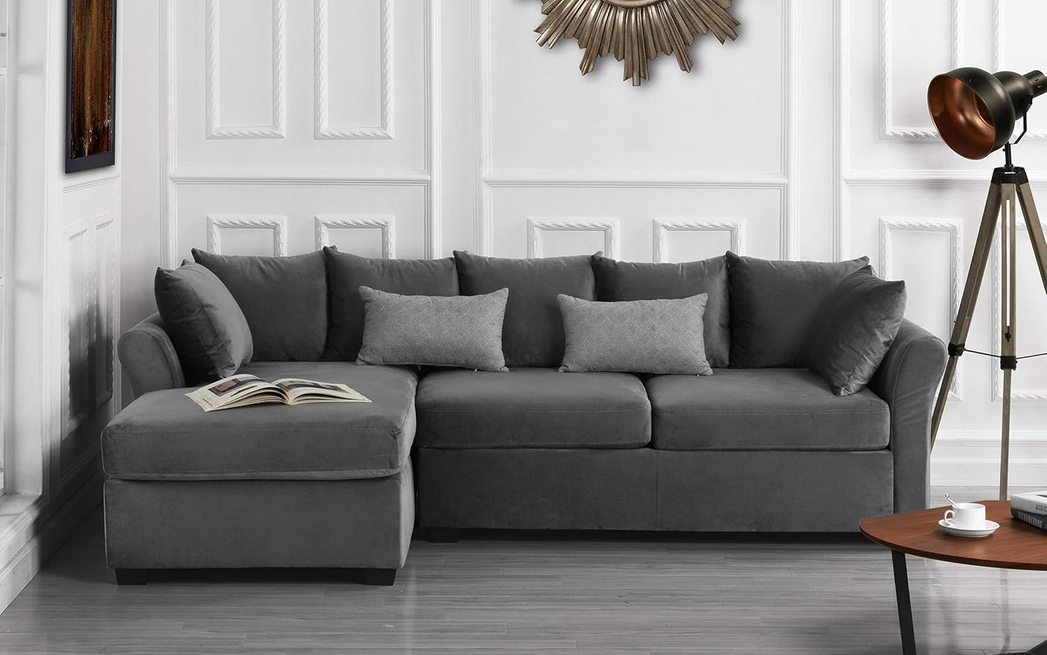 Modern Large Velvet Sectional Sofa L Shape Couch With Extra Wide Chaise Lounge Light Grey