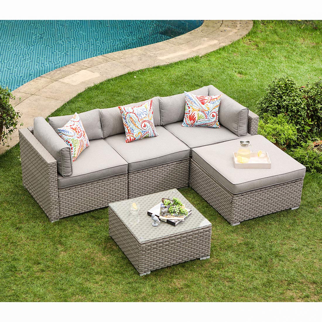 Cosiest 5 Piece Outdoor Furniture Set Warm Gray Wicker Sectional Sofa W Thick Cushions Glass Coffee Table 1 Ottoman 3 Floral Fantasy Pillows For